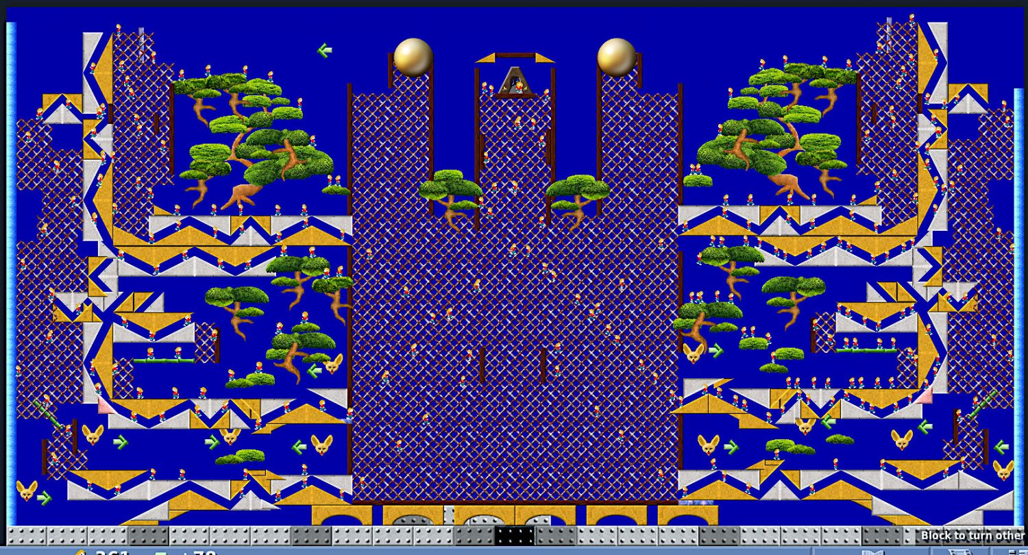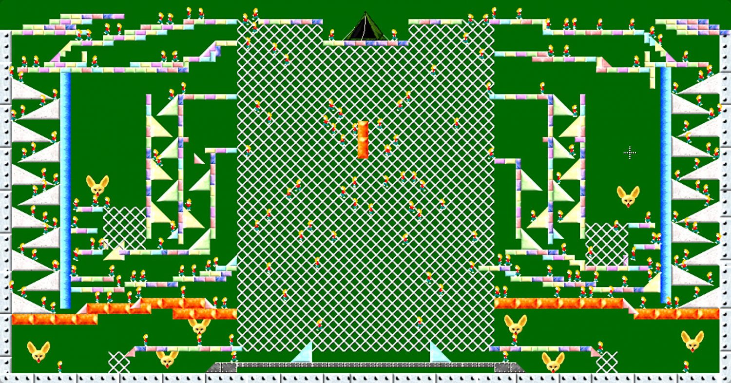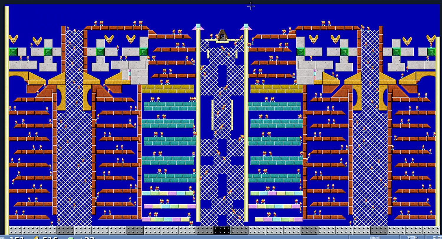Some of Ken’s LIx levels. I mostly make complicated (sometimes symmetrical) paths and fiddle with the design until they are mostly working … and usually still full of unused parts, and great chunks of unused Lix pathways. I don’t usually send many Lixes off on a walk, but I generally pump the number and spawn speed for screenshots, to trace the paths. So: