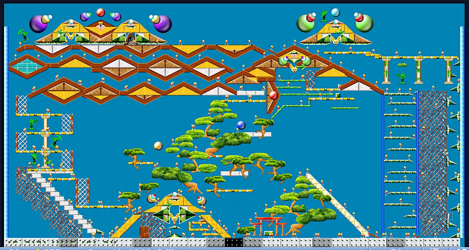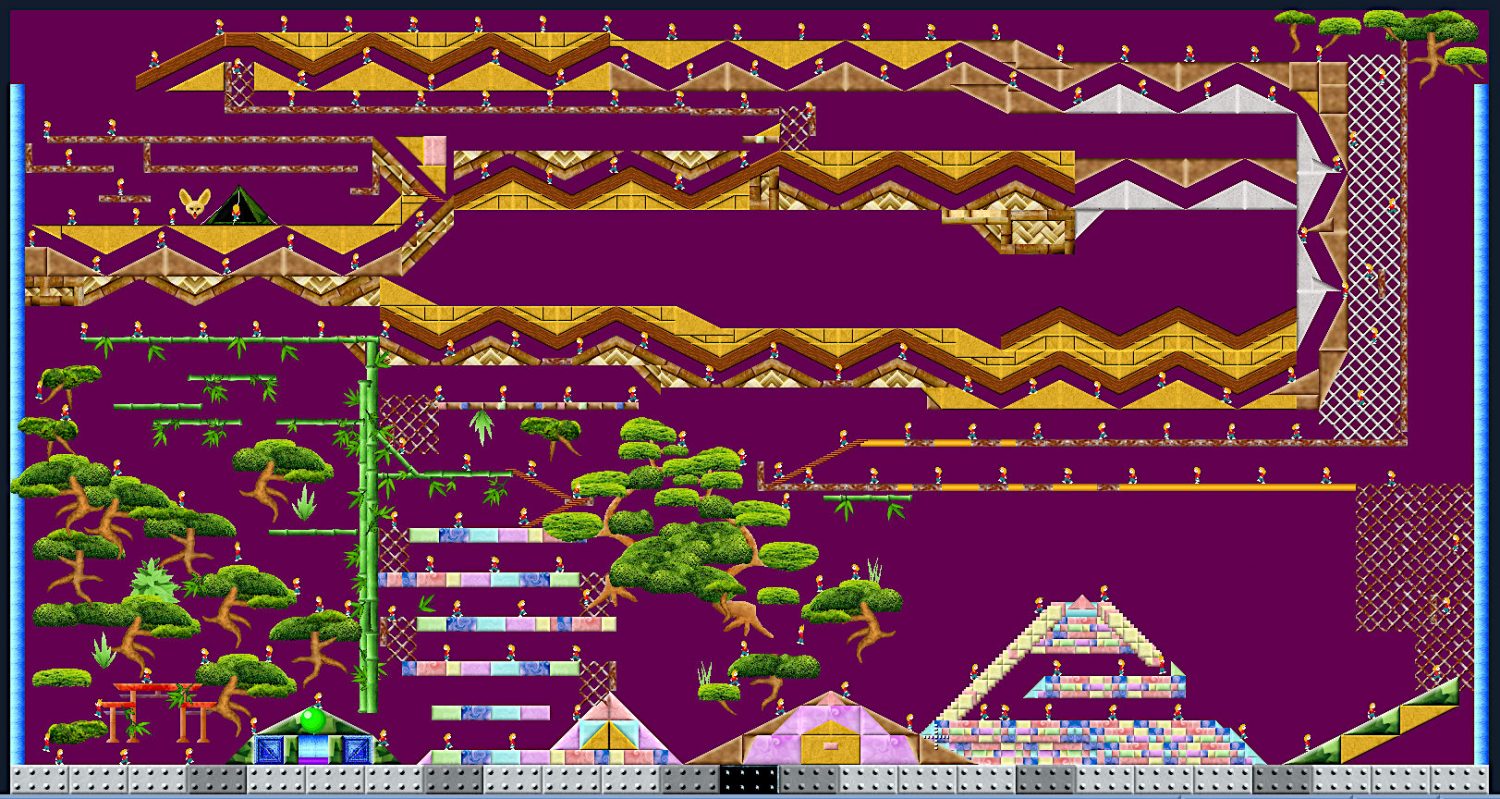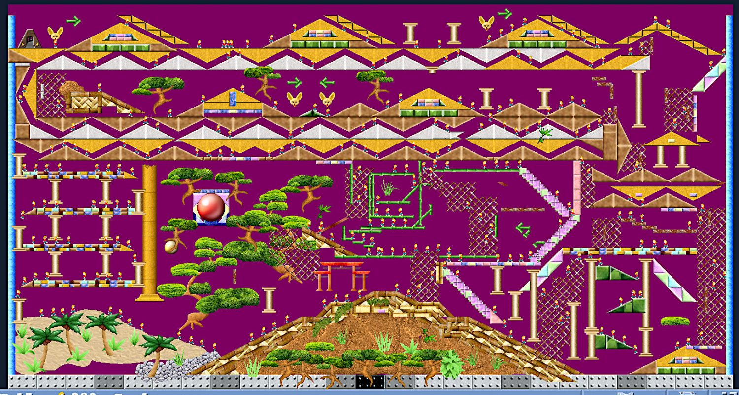 Some of Ken’s LIx levels. I mostly make complicated (sometimes symmetrical) paths and fiddle with the design until they are mostly working … and usually still full of unused parts, and great chunks of unused Lix pathways. I don’t usually send many Lixes off on a walk, but I generally pump the number and spawn speed for screenshots, to trace the paths. So: